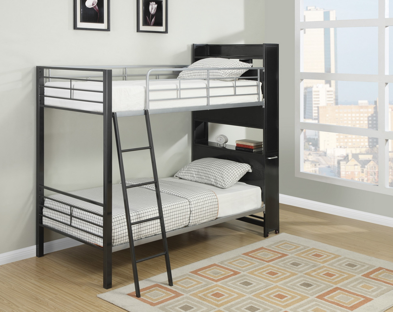 Fun with function, this unique twin-over-twin size multi-functional loft bed creates a fun and usable space in your youth bedroom. This piece will allow your child to study in the comfort of his or her own bedroom! Clean lines, sturdy metal straight rails, and a ladder make this bed safe and easy to use. A bookshelf headboard creates a cool space and features a table surface which rolls out ideal for homework, play, and snacks.