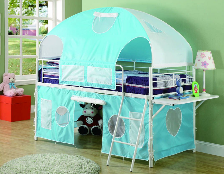 Sleep and playtime just got more enjoyable with this tent style loft bed. This group is manufactured from metal and finished in a gloss white. Additional shelf on the end for additional functionality. Blue fabric is included, some assembly is required.