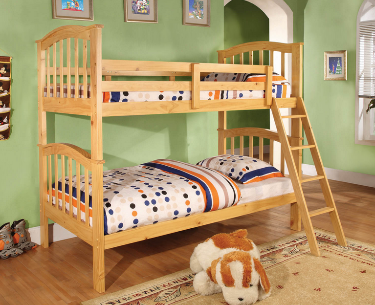 This twin over twin bunk bed offers full length guard rais for safety. Made of select pine woods and veneers in a light natural color, this bunk bed is a great additional to any youth's room.