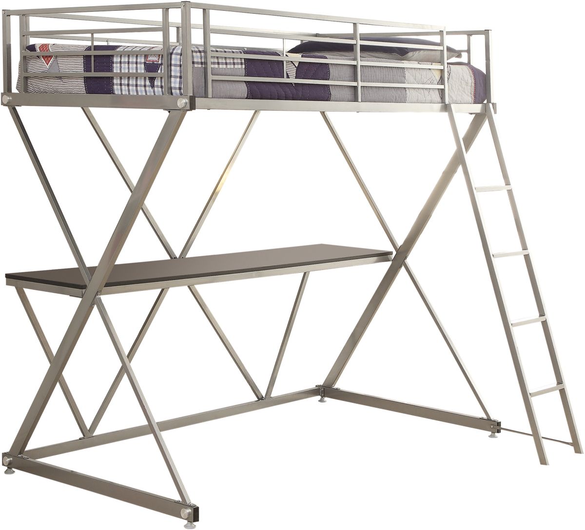 Dramatic X-frame add contemporary geometric flair to this workstation loft bed finished in silver