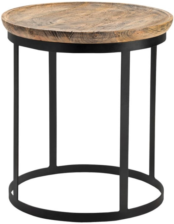The end table has a black metal base contrasted by the light-brown top made of mango wood