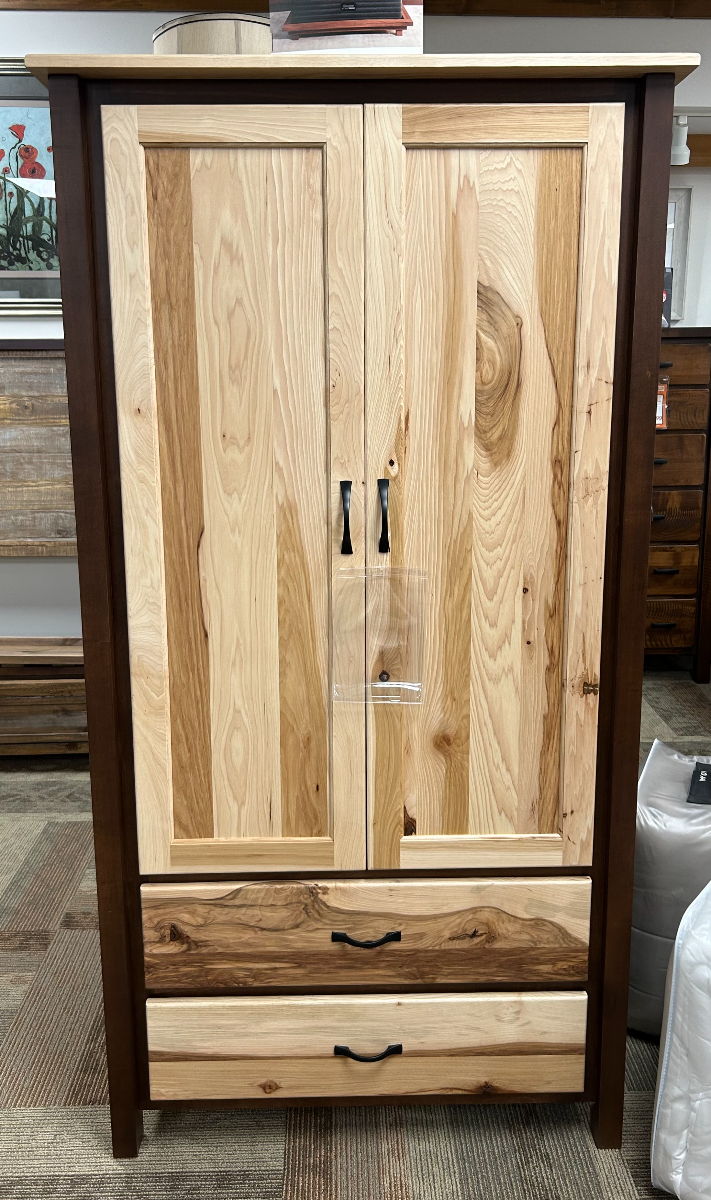 This striking wardrobe blends maple and hickory woods, showcasing the natural beauty of clear-stained hickory. Featuring a clothes rack and two drawers, it offers both style and functionality. The wardrobe’s craftsmanship highlights the unique character of the wood, making it a standout piece in any room.Read More