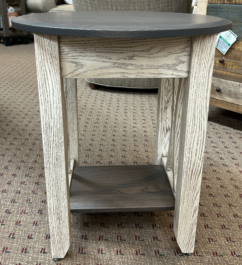 Refresh your space with this stylish round end table, featuring a dynamic two-tone finish. Crafted from solid wood, it offers a range of customizable wood and stain options to complement any décor. Its circular design provides a versatile surface perfect for lamps, drinks, or décor items. With its elegant form and quality craftsmanship, this end table effortlessly combines modern charm with practical functionality.Read More
