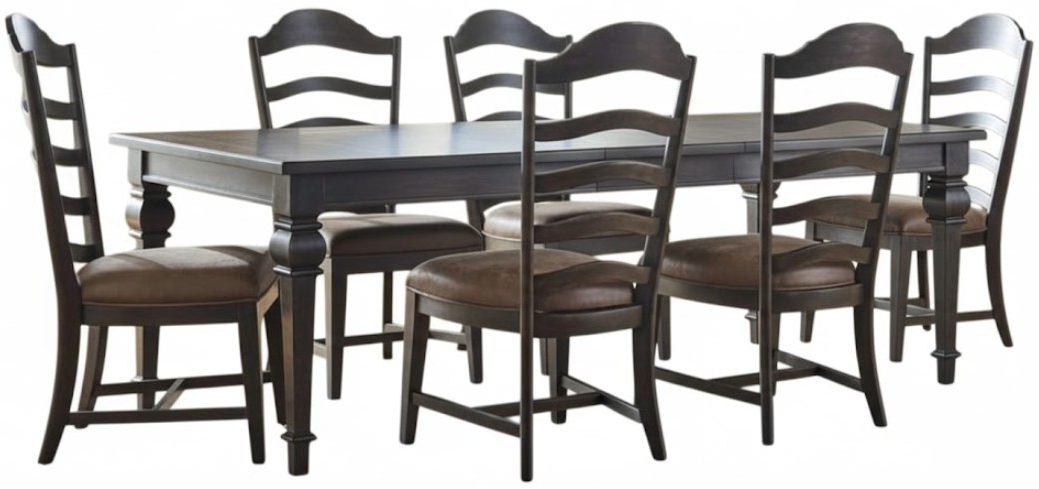 Forget dining out and make your home the best place to enjoy a meal with the Paradise Valley seven piece rectangular table set. This set features a saddle brown finish and includes the rectangular leg table and six upholstered ladder back side chairs.Read More