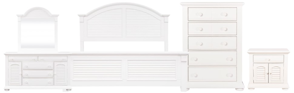 The panel bed features louvered panels and arched crown molding. The dresser has two louvered panel doors and five drawers including two smaller flip down top drawers. Attach the arched louvered panel mirror with a beveled edge with the included bolt-on supports. The chest offers an additional five drawers of storage, with the top three drawers having bluff-cut drawer fronts to give the illusion of smaller drawers, while still offering deep storage. Place the unique one drawer, two door nightstand next to your bed and enjoy the abundance of storage with the felt lined top drawer and the adjustable shelf behind the louvered panel doors. With cottage design always in fashion, make the Summer House I a staple in your home.
