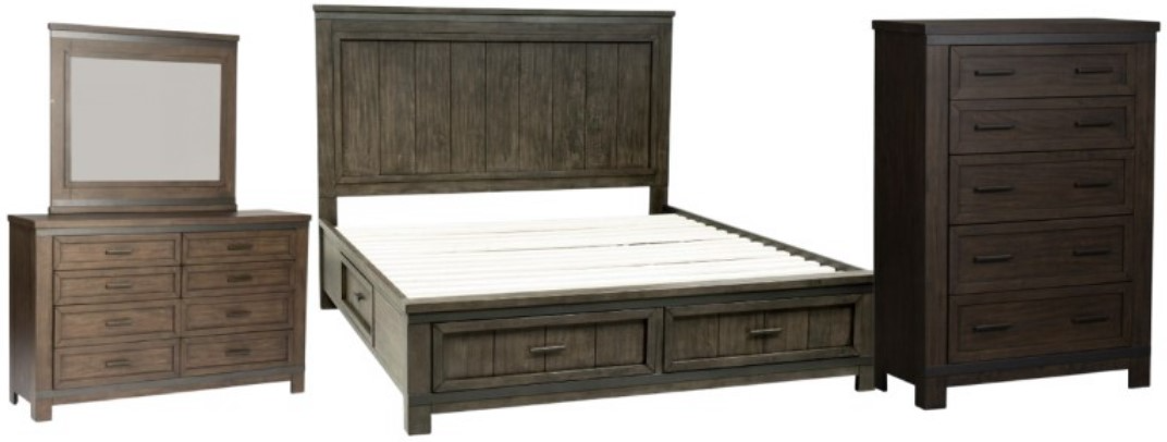 Enhance your home with the Thornwood Hills queen two-sided storage bed, dresser, mirror, and chest. Crafted of rubberwood solids with mango veneers, this kit features a rock beaten grey finish with saw cuts, straight line cases with wide pilasters and block feet, metal strip accents.Read More