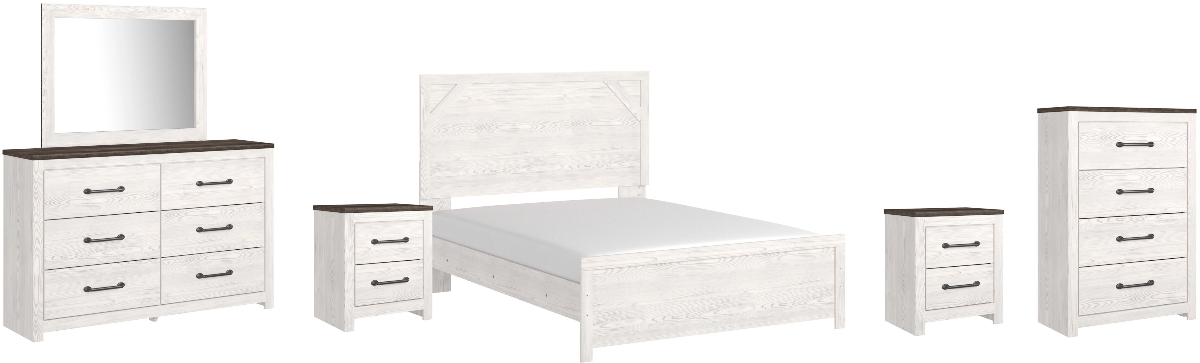 Includes queen panel bed (headboard, footboard and rails), 6-drawer dresser with mirror, 4-drawer chest and two 2-drawer nightstands