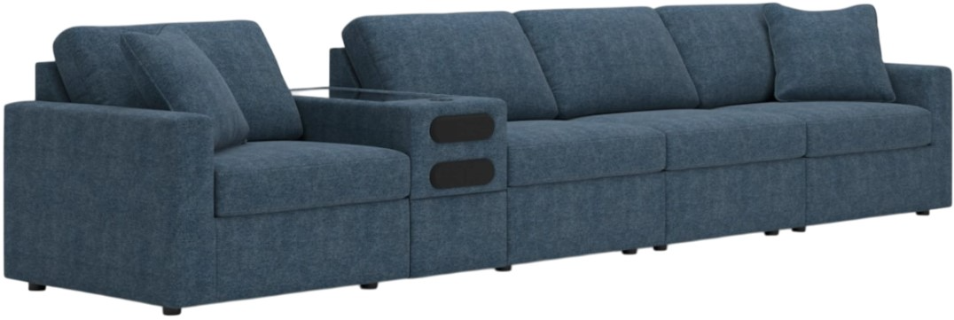 Includes 5 modular pieces: left-arm facing corner chair, audio console with storage, 2 armless chairs and right-arm facing corner chair