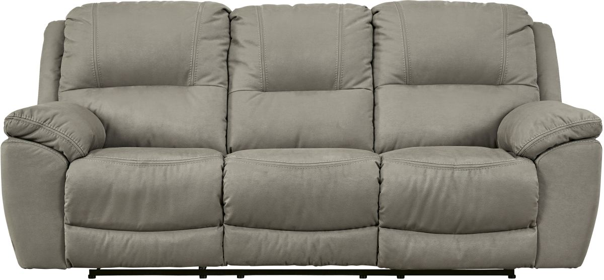 Kick back, relax, and enjoy some sports on TV with this reclining sofa. You will love its double stuffed pillow top arms and soft-as-suede faux leather upholstery. The family-friendly dark gray color and creative stitching add panache. Recline in comfort even if floor space is limited, thanks to the space-efficient zero wall design.Read More